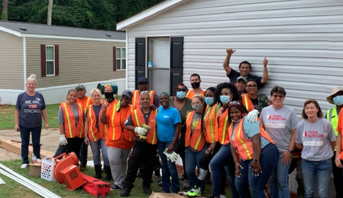 “Team Rubicon’s typical role is disaster response. We recently helped clean up after the tornadoes in Newnan, GA and currently have a group in Baton Rouge mucking out houses that have been flooded. Not all of our volunteers can take a week off on short notice, so Team Rubicon has a Neighbors Helping Neighbors program that empowers us to find ways to serve closer to home,” said Patty Kurz, a volunteer leader from Team Rubicon “When I learned that YES Hug-A-Home was being done for a veteran, I knew it was something Team Rubicon Greyshirts (what we call our volunteers) would love to assist. As one of the Atlanta area volunteer leaders, I sent out the call for people and, within two days, I had all the volunteers I needed. Working alongside YES employees, our team was able to complete the entire project in half the expected time. We had a rewarding day of dirty work and fun! All while building relationships among our Rubicon team and with the YES Communities team.”